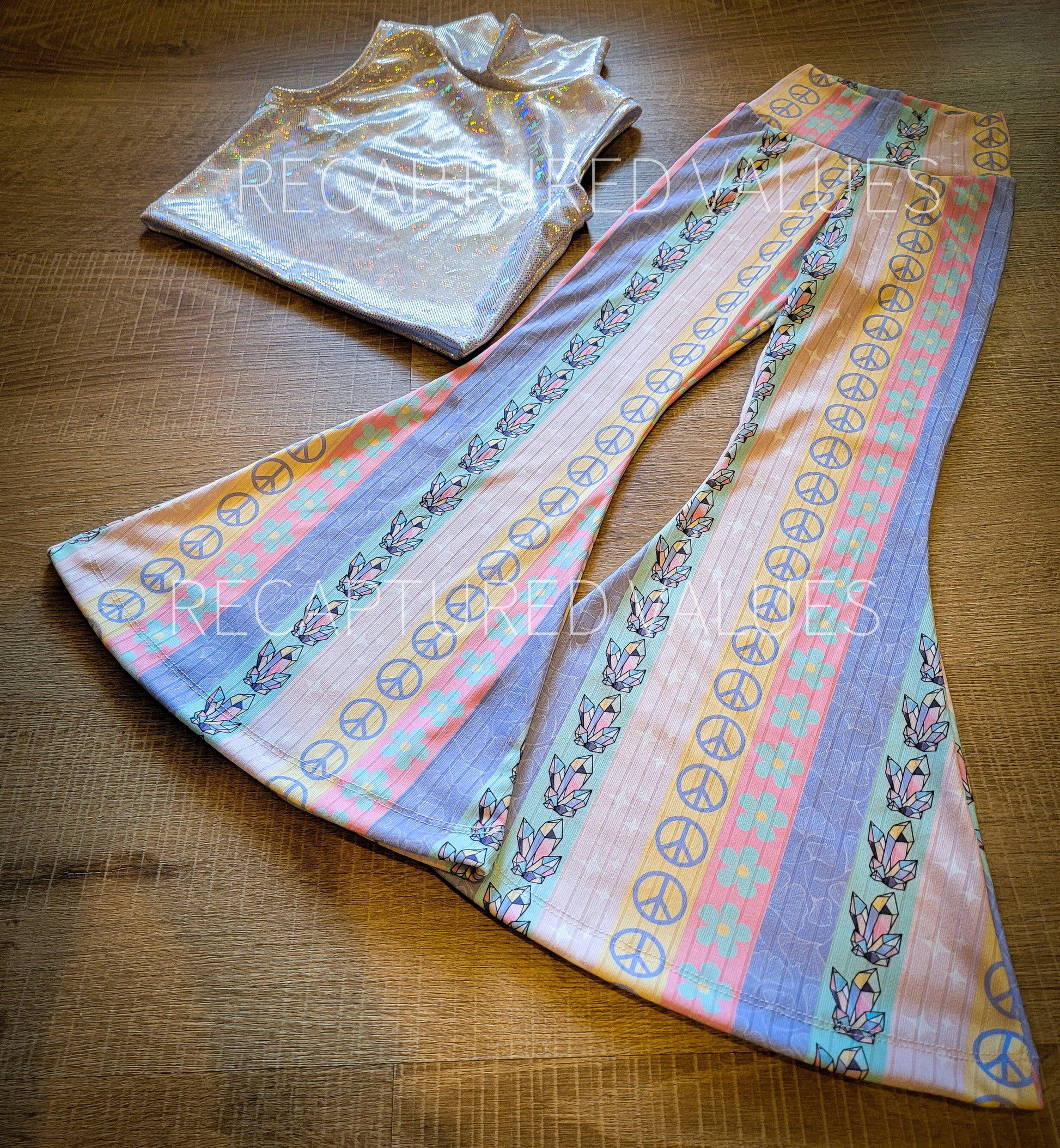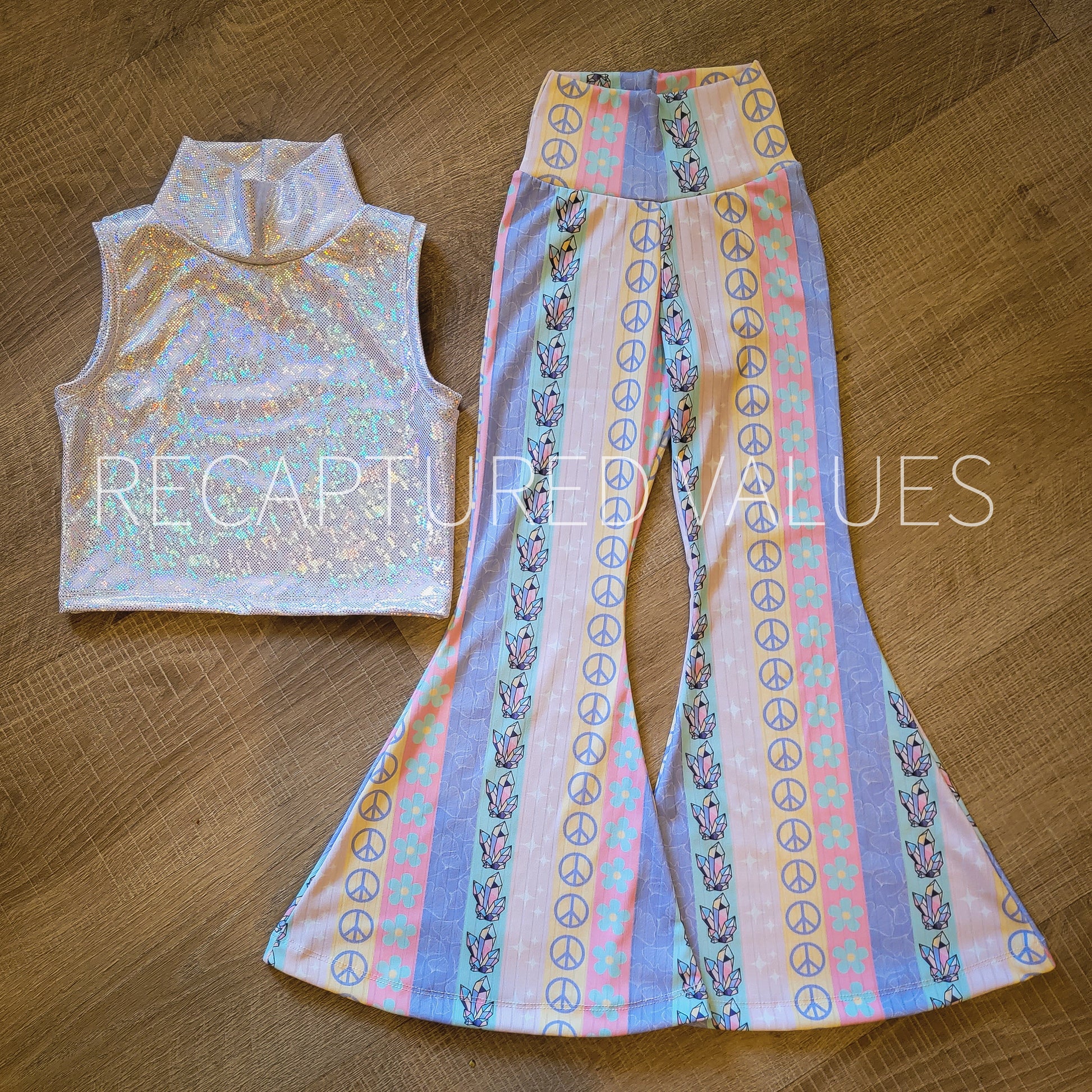 Lainey Wilson Taylor Swift Eras Toddler Kids Sized Outfit Hippie Print Flared Bell Bottoms and Holographic Mock Neck Tank 2 Piece Outfit