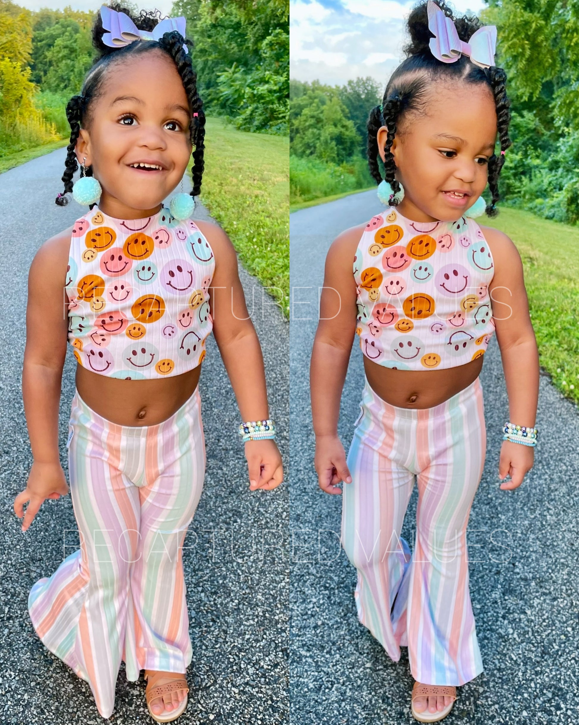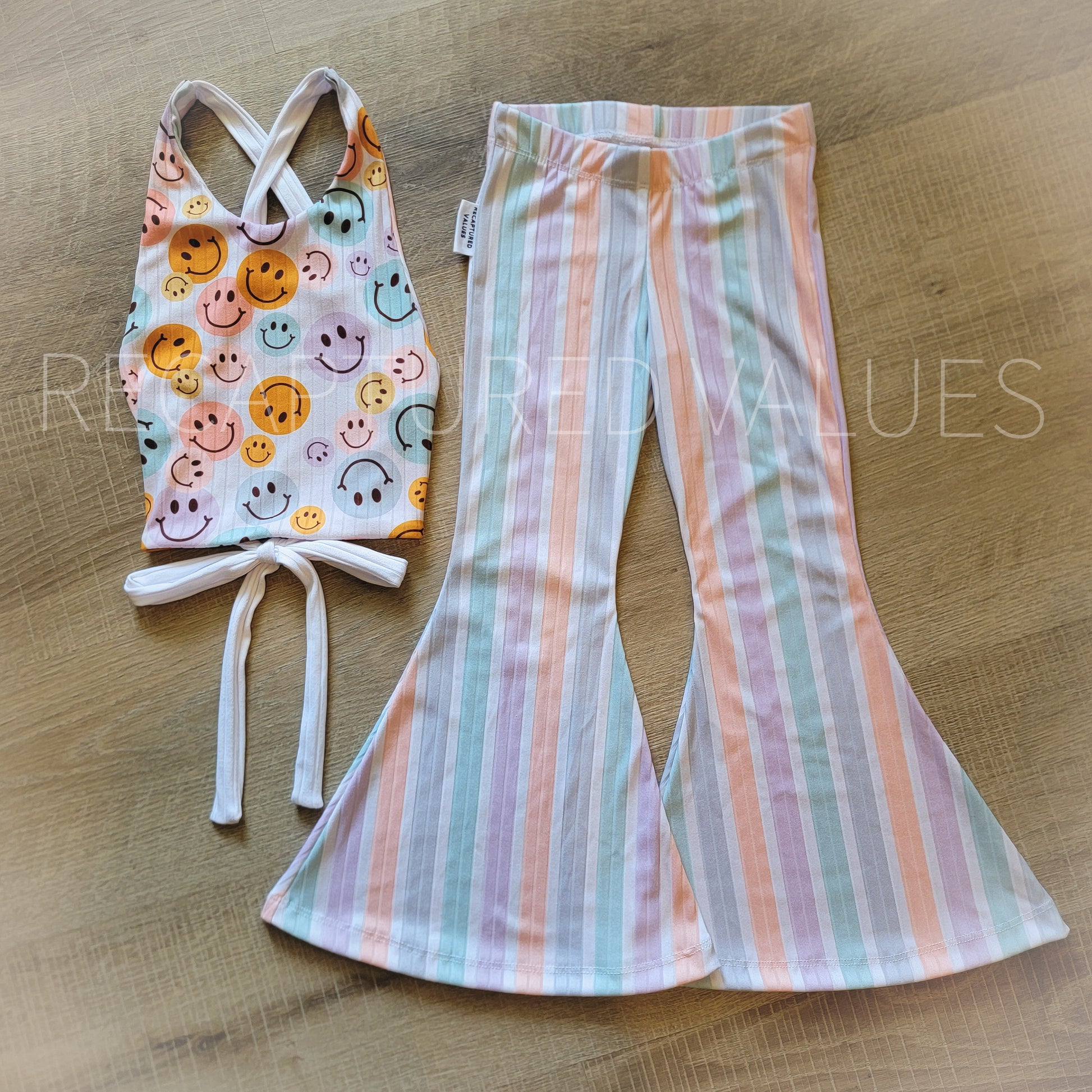Groovy Retro Hippie Smiley Halter Crop Top & Striped Flared Bell Bottoms for Baby and Toddler Girls, Seafoam Green, Mango, Coral, Lavender