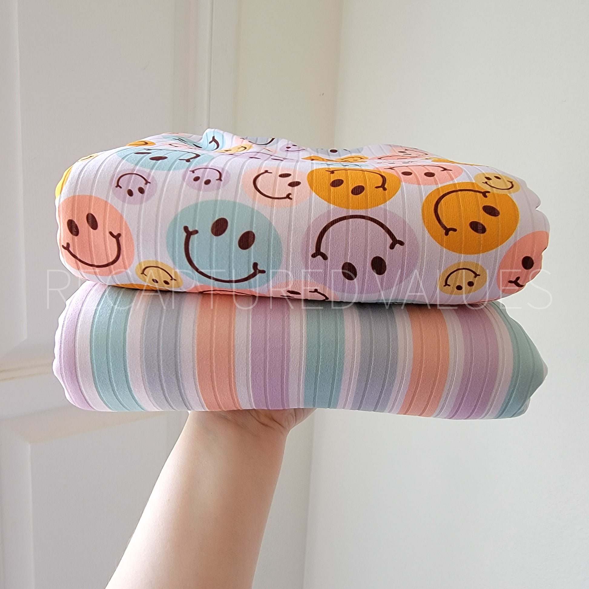 - Reversible Top: Super groovy smiley face pattern on one side and matching stripes on the other