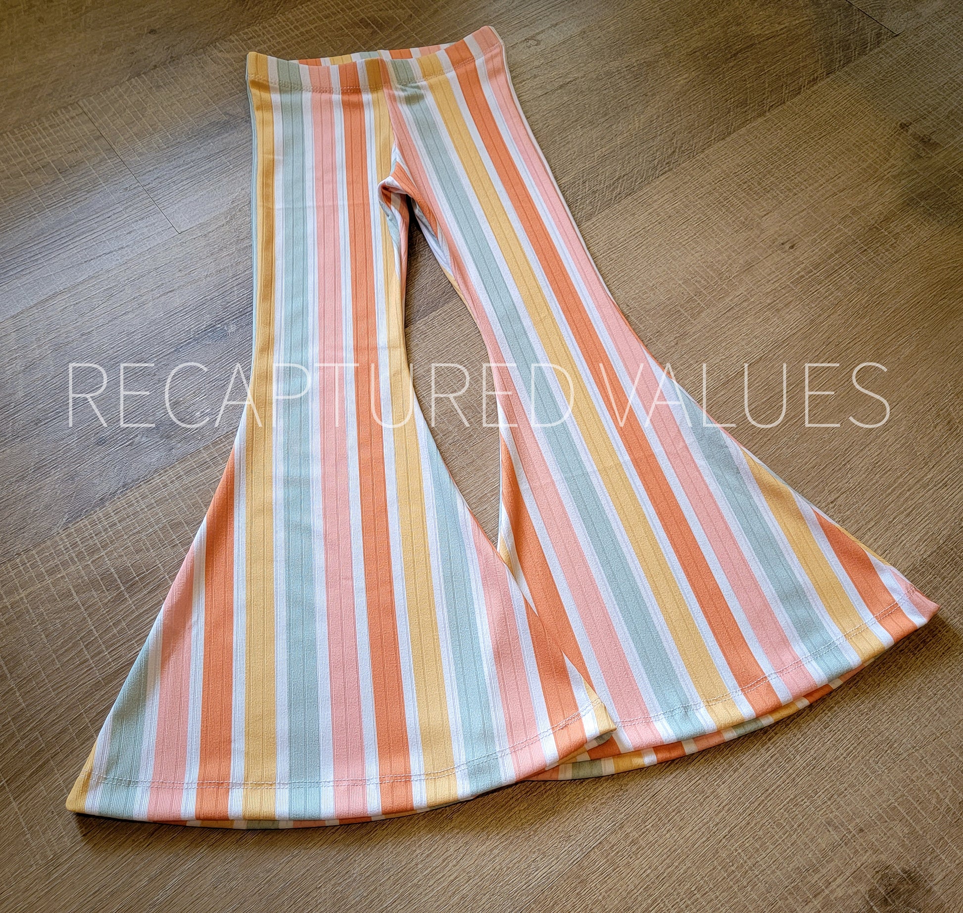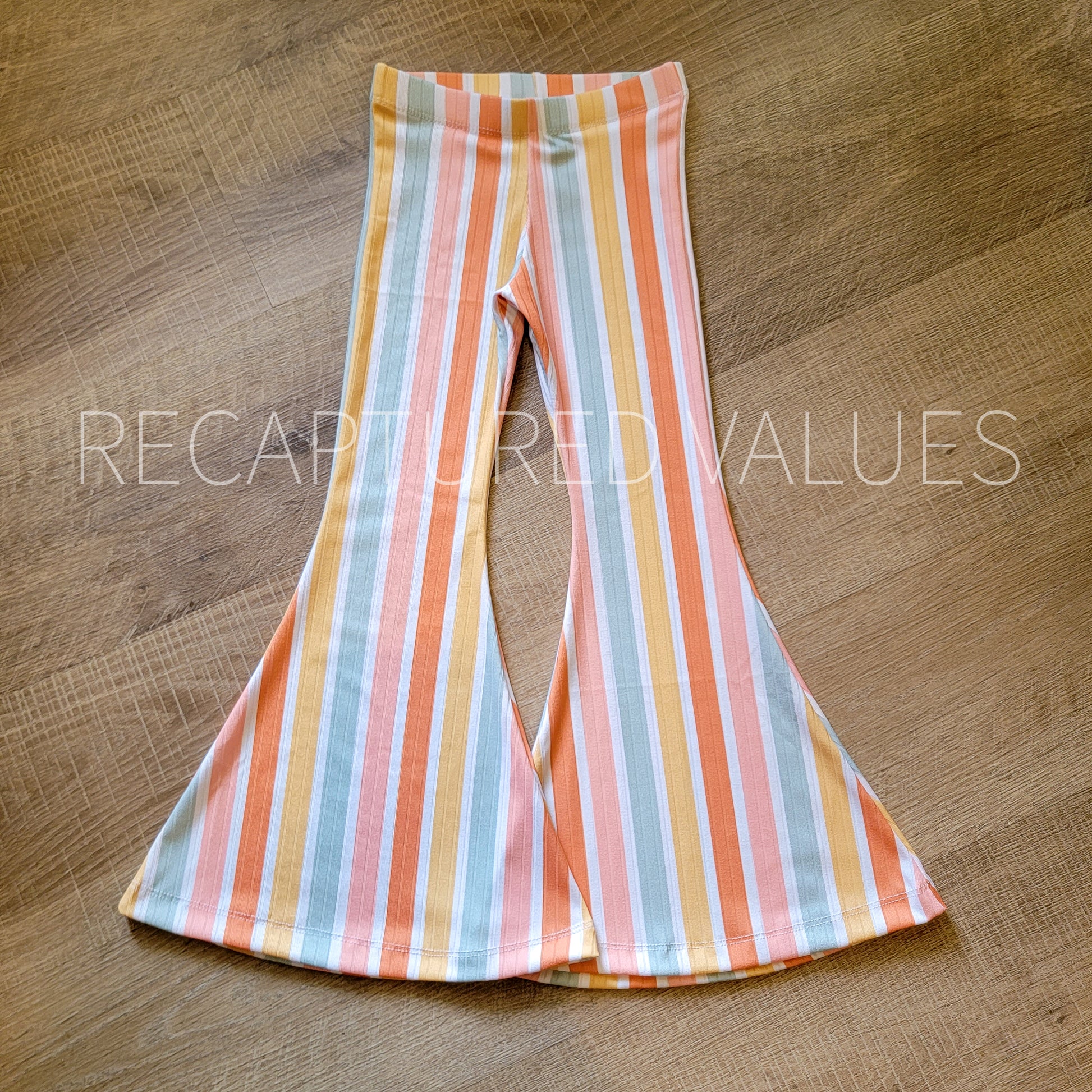 Groovy Retro Hippie Stripe Flared Bell Bottoms for Baby and Toddler Girls, Coral Spice, Peach, Minty Sage, Sunflower Yellow
