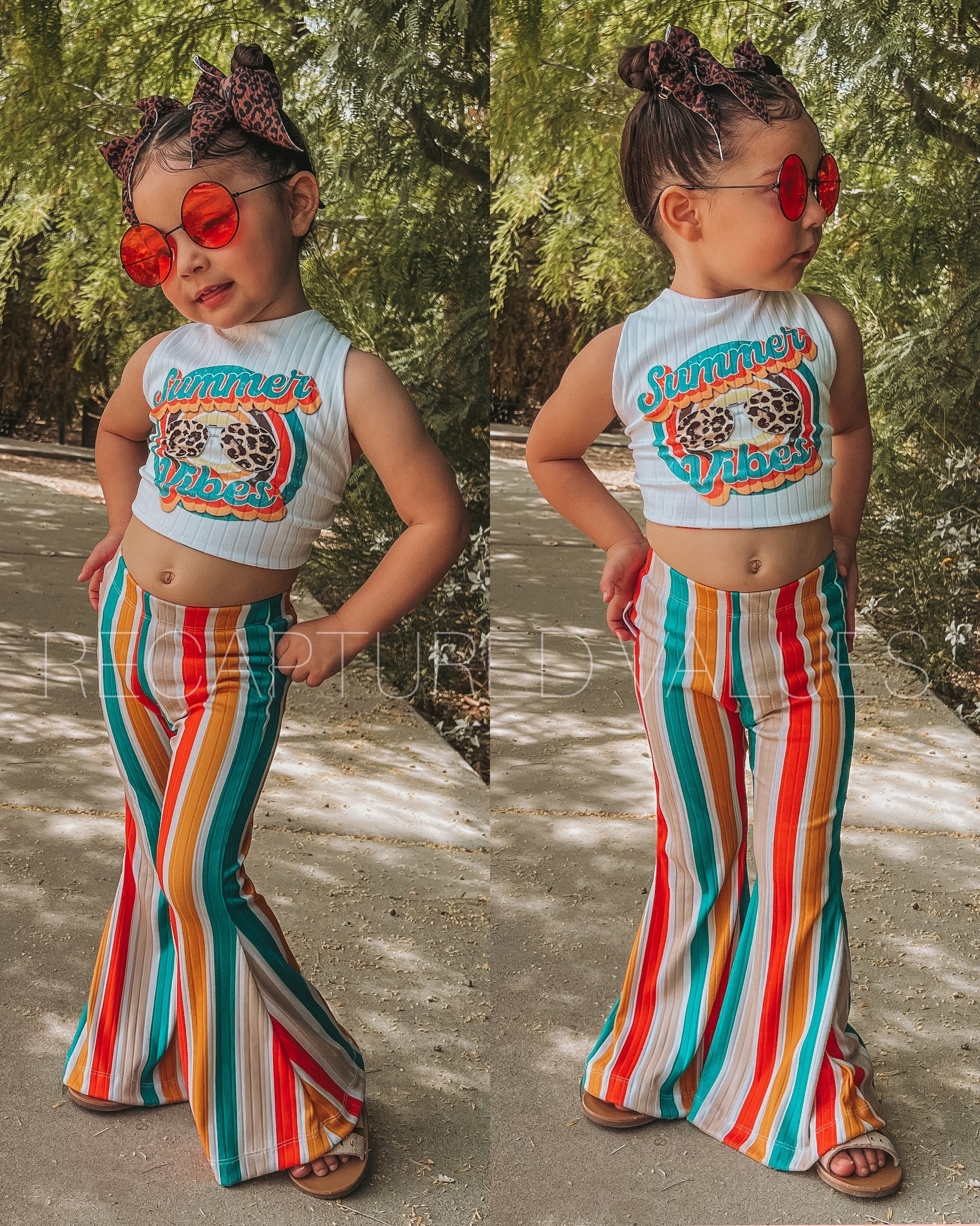 Groovy Retro Hippie Summer Vibes Crop Top & Stripe Flared Bell Bottoms for Baby/Toddler Girls, Deep Sea Green, Beige, Crimson Red, Golden
