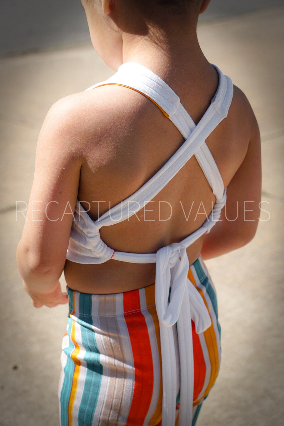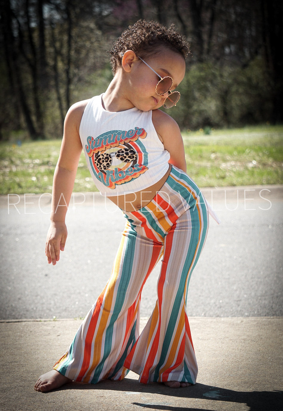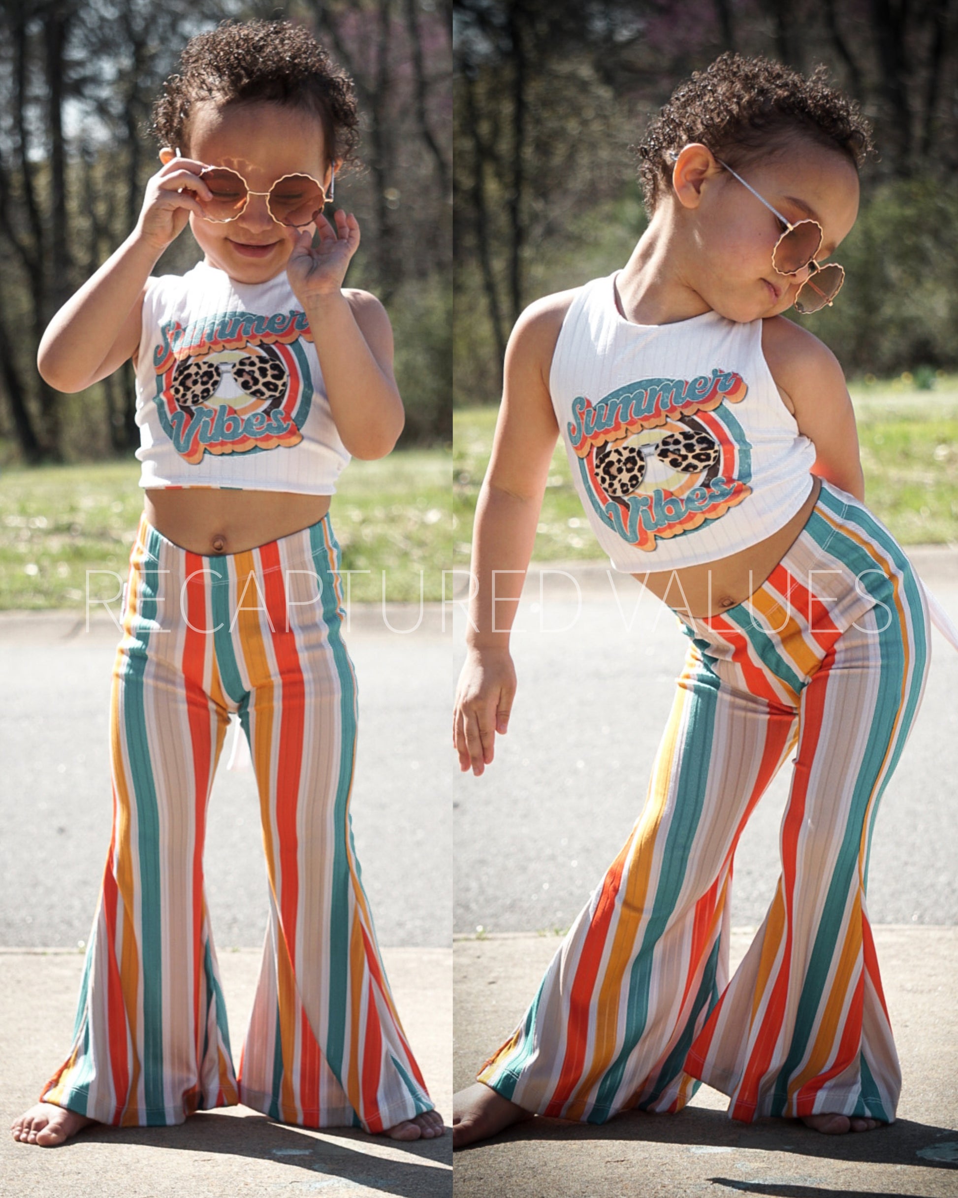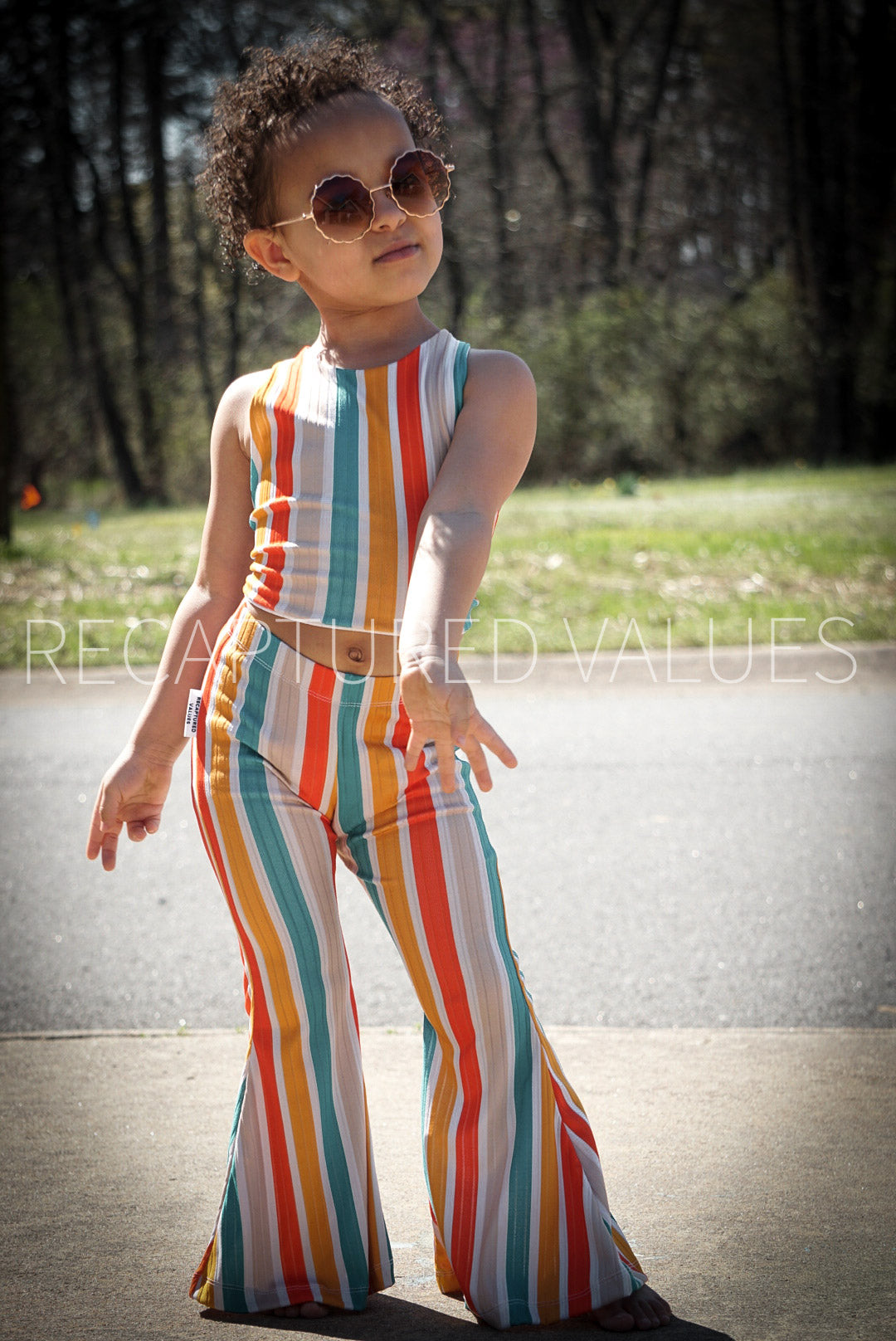 The set includes a charming open back halter crop top and a pair of coordinating stripe flared bell bottoms that includes Deep Sea Green, Beige, Crimson Red, Golden, and Linen White hues. Each piece is carefully handcrafted with comfort and style in mind, ensuring that your little fashionista feels her best while rocking this vintage-inspired outfit with a new flare.