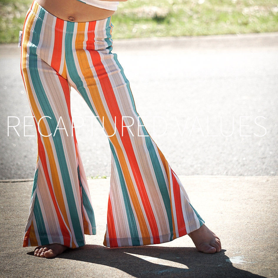 - Coordinating stripe flared bell bottoms in Deep Sea Green, Beige, Crimson Red, Golden, and Linen White