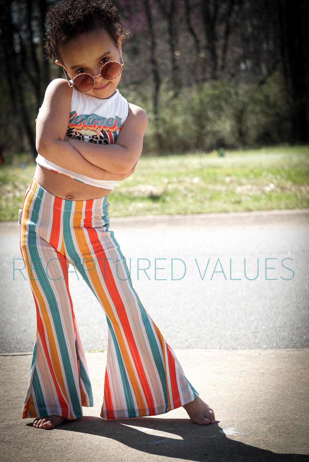 Paired with our signature stripe flared bell bottoms, this set creates an effortlessly chic look that will make your baby or toddler girl stand out. The stripes are a combination of Deep Sea Green, Beige, Crimson Red, Golden, and Linen White hues which perfectly complement the reversible crop top, creating a harmonious and eye-catching ensemble. The flared silhouette adds a touch of playfulness and allows for easy movement, making it ideal for active little ones. If your child’s measurements fit multiple sizes, send us a message and we can be sure to customize a size blend specific to measurements. That is the beauty of handmade, no need for a baggy waist because extra length is needed or vice versa.