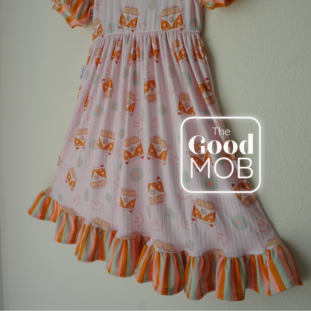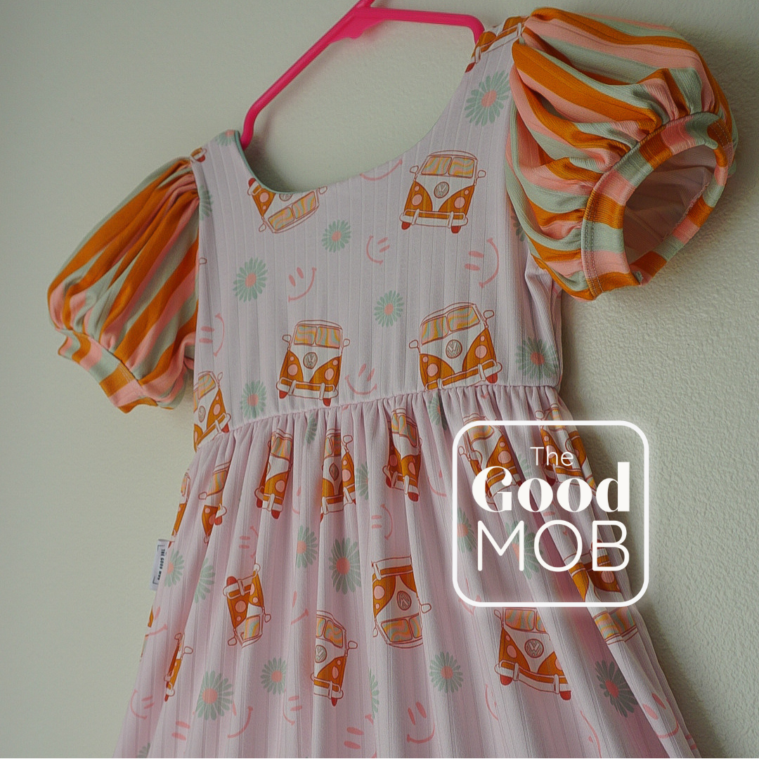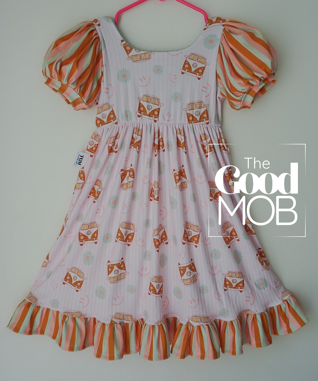 Handmade Retro Bus Dress for Girls – Puff Sleeve Twirl Dress with Striped Ruffle Hem | 70s Vibe Kids Clothing | The Good Mob